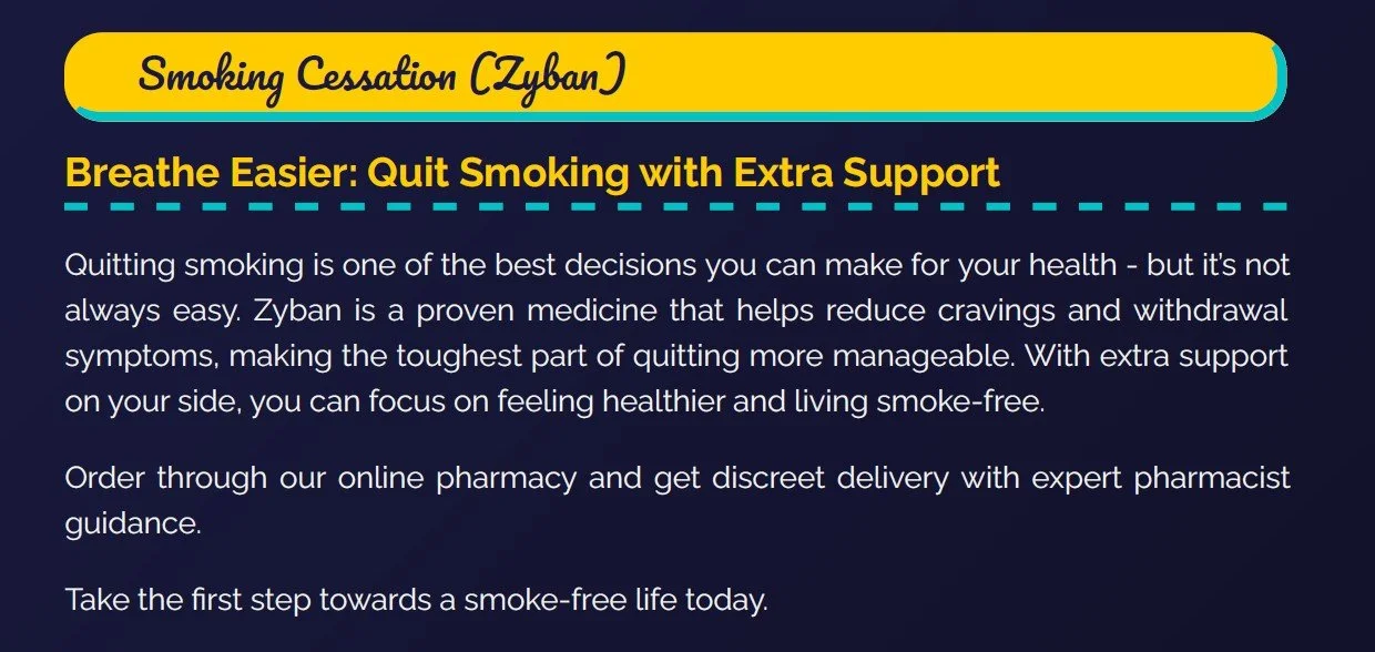 Customer appeal: Aimed to attract both transactional and emotional searches (“Quit smoking support,” “Buy Zyban online”). Headline balances keyword and patient appeal.